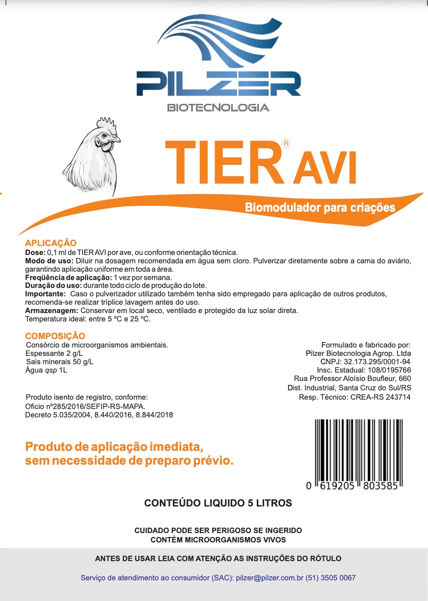 O Tier Avi é um modulador biológico, produzido com linhagens bacterianas isoladas do ambiente natural, desenvolvido para aplicação em ambientes de criações de aves de corte ou postura, proporcionando um ambiente mais saudável para o desenvolvimento dos animais.