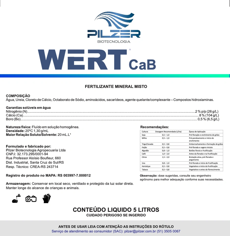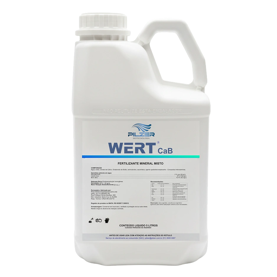 WERT CaB é um fertilizante foliar líquido formulado para fornecer Cálcio, Boro e Nitrogênio de forma balanceada, atendendo às fases críticas do ciclo das culturas agrícolas. A combinação desses nutrientes promove maior pegamento floral, frutos mais firmes, melhor formação de grãos e maior resistência estrutural das plantas.
